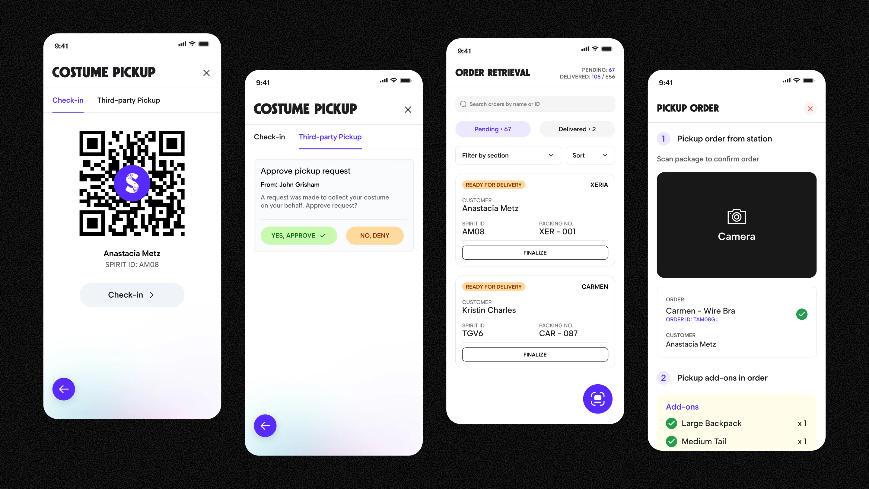 Staff manage costume pickup and handoff digitally using role-based access scanning verification and real-time tracking removing paper lists and manual reconciliation